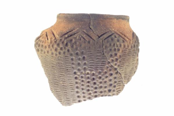 orlo arrotondato, leggermente ingrossato, breve labbro poco estroflesso, spalla indistinta e corpo piriforme; sulla spalla, incisioni abbastanza larghe e profonde a doppio zig zag; al di sotto, composizione di impressioni circolari (diam. cm. 0.4-0.5) e file di sottili trattini (lungh. cm.0.5-0.6) orizzontali incisi.