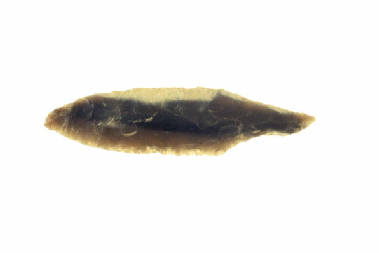 Punta foliata peduncolata con ritocco piatto invadente bifaccialee lamellare; peduncolo a ritocco semplice bifacciale.