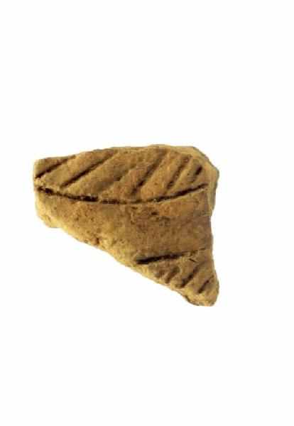 Parete a profilo leggermente curvilineo. Sulla parete due fasce orizzontali parallele alternate a una fascia inornata, delimitate da linee orizzontali incise e riempite all¿interno da trattini obliqui ottenuti a pettine.