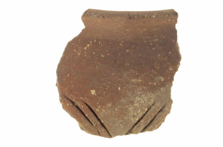 Orlo appiattito, obliquo verso l'interno, breve labbro verticale a profilo rettilineo, spalla mediamente pronunciata a profilo rettilineo. Incisioni mediamente larghe e profonde a zig zag triplo spezzato.