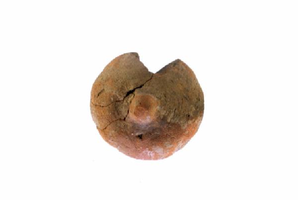 Piccolo coperchio a calotta schiacciata, con pomello verticale a sezione iregolarmente quadrangolare e terminazione arrotondata.