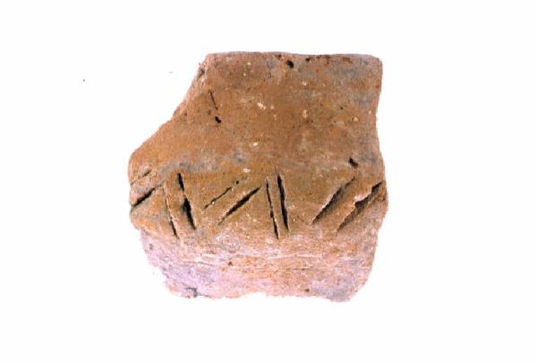 Orlo appiattito, labbro leggermente rientrante a profilo curvilineo, attacco distinto del corpo a profilo curvilineo. Incisioni sottili a doppio zig zag spezzato all'attacco del corpo.