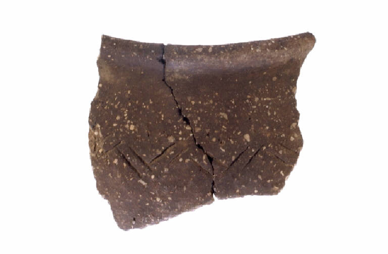 Orlo arrotondato, labbro verticale a profilo rettilineo, spalla mediamente accentuata, corpo ovoide. Incisioni a doppio zigzag.