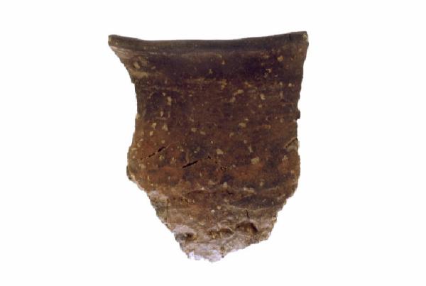 Orlo appiattito, breve labbro leggermente estroflesso a profilo curvilineo, spalla mediamente pronunciata, corpo ovoide. Impressioni digitali con scarso riporto d'argilla sul corpo.