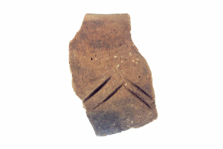 Orlo piatto, leggermente obliquo verso l'interno e ingrossato verso l'esterno, breve labbro leggermente estroflesso a profilo curvilineo, spalla poco pronunciata, corpo ovoide. Incisioni profonde a doppio zigzag sulla spalla.
