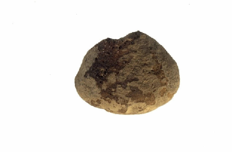 Fusaiola troncoconica con base concava e netta depressione in corrispondenza del foro. Leggere scanalature radiali sulla base.