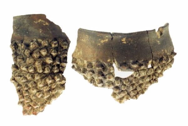 Orlo arrotondato, labbro a profilo curvilineo leggermente estroflesso, spalla poco pronunciata, corpo cilindro-ovoide, fondo piano. Su tutto il corpo, dalla spalla fino al fondo bugne plastiche probabilmente ottenute a punzone, con profondi segni della lavorazione tra le bugne.