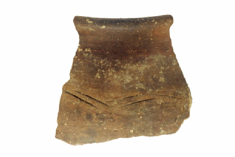 Orlo arrotondato e ingrossato, labbro estroflesso a profilo curvilineo, collo troncoconico,spalla sommariamente distinta, corpo ovoide. Incisioni sottili e profonde a zigzag doppio, ad angoli molto ottusi, sulla spalla.