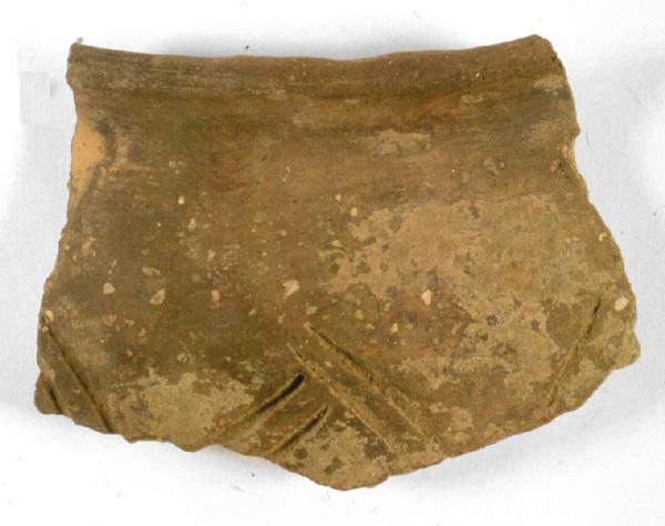 Orlo ingrossato arrotondato, breve labbro leggermente estroflesso a profilo curvilineo, spalla leggermente arrotondata. Profonde incisioni a doppio zigzag interrotto sulla spalla.
