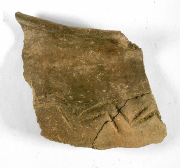 Orlo ingrossato obliquo verso l'esterno, labbro estroflesso a profilo curvilineo, spalla accentuata, corpo ovoide. Profonde incisioni a doppio zigzag interrotto sulla spalla.
