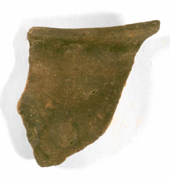 Orlo ingrossato piatto, labbro estroflesso a profilo curvilineo, spalla sfuggente, corpo ovoide. Impressioni circolari sulla spalla.