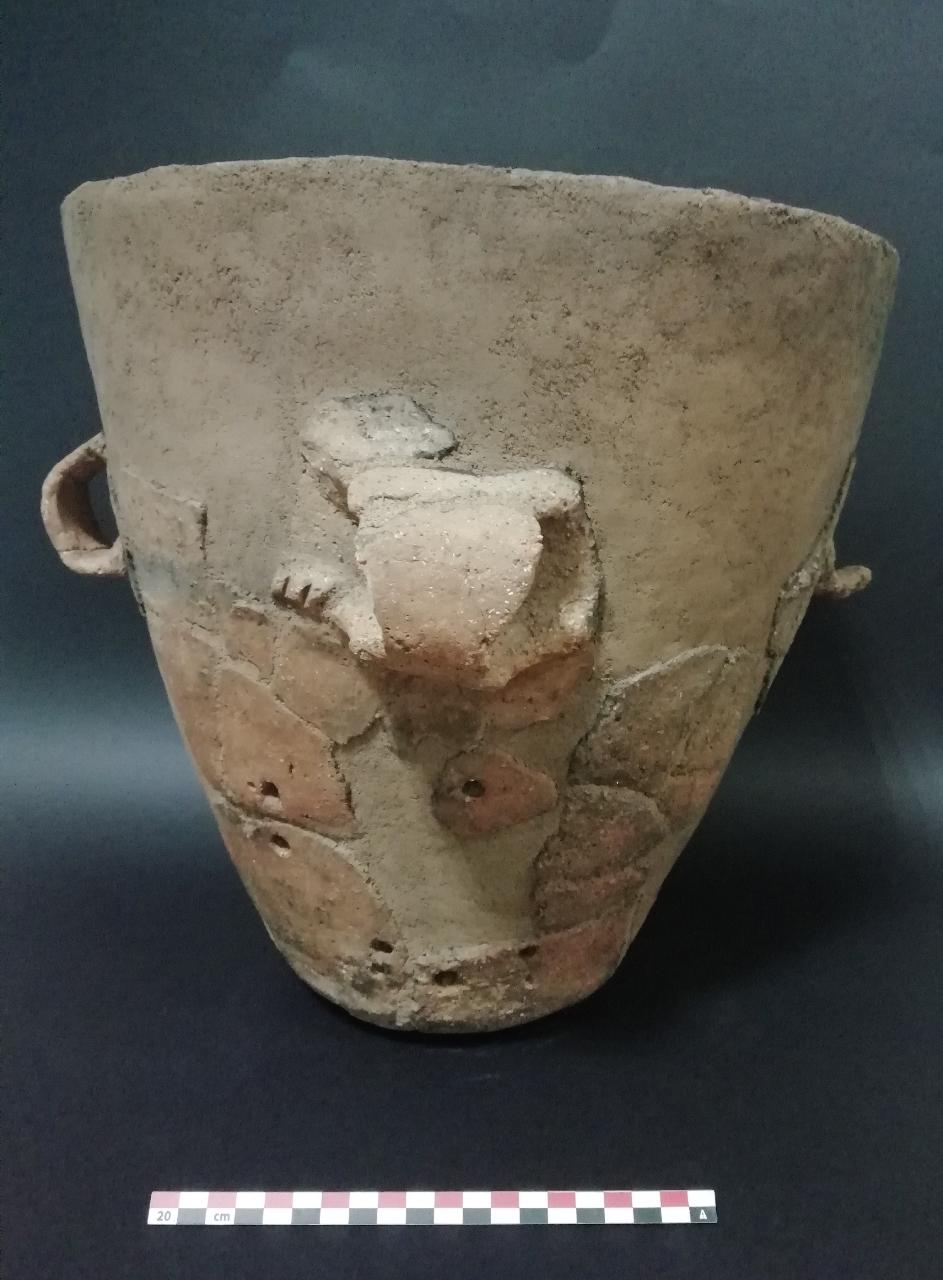 Vaso a profilo troncoconico. Decorato con leggere incisioni di triangoli campiti a reticolo, cordone orizzontale impresso e due anse a nastro che s'impostano lungo il cordone.