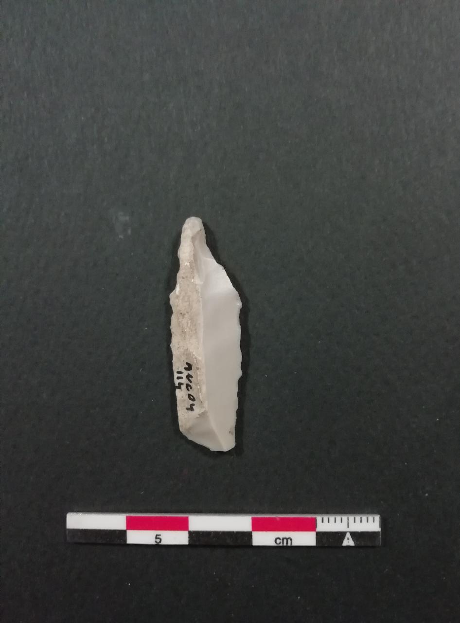 Becco dritto (Bc2) su lama a sezione triangolare in selce grigio-bianca con cortice. Ritocco erto sia lungo il lato destro che nella parte distale a formare un becco dritto.