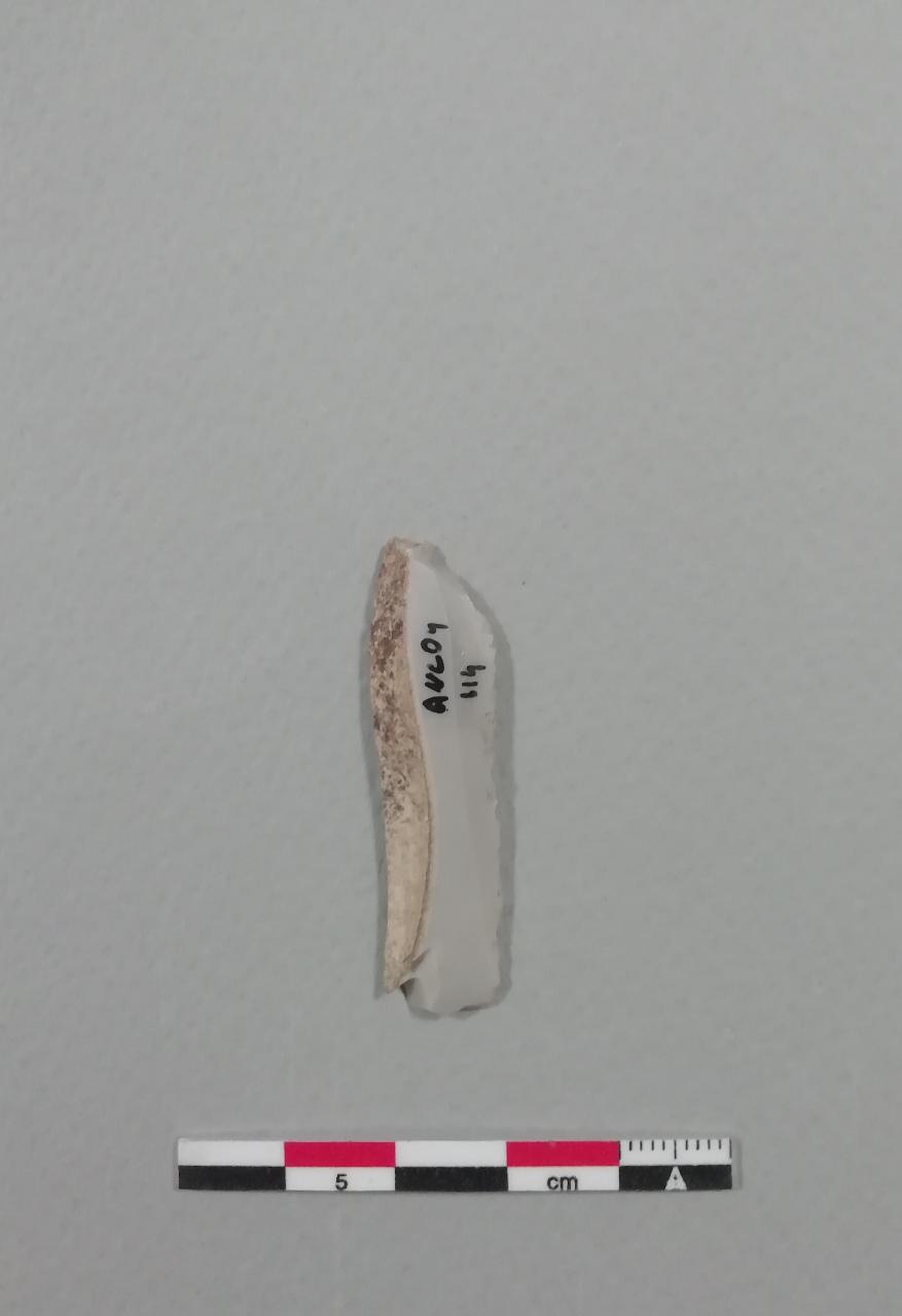 Raschiatoio denticolato su lama (D2) a sezione trapezoidale in selce bianca con cortice. Ritocco piatto marginale inverso sul lato sinistro e ritocco semplice marginale inverso a formare un piccolo incavo nella parte inferiore del lato sinistro.