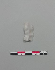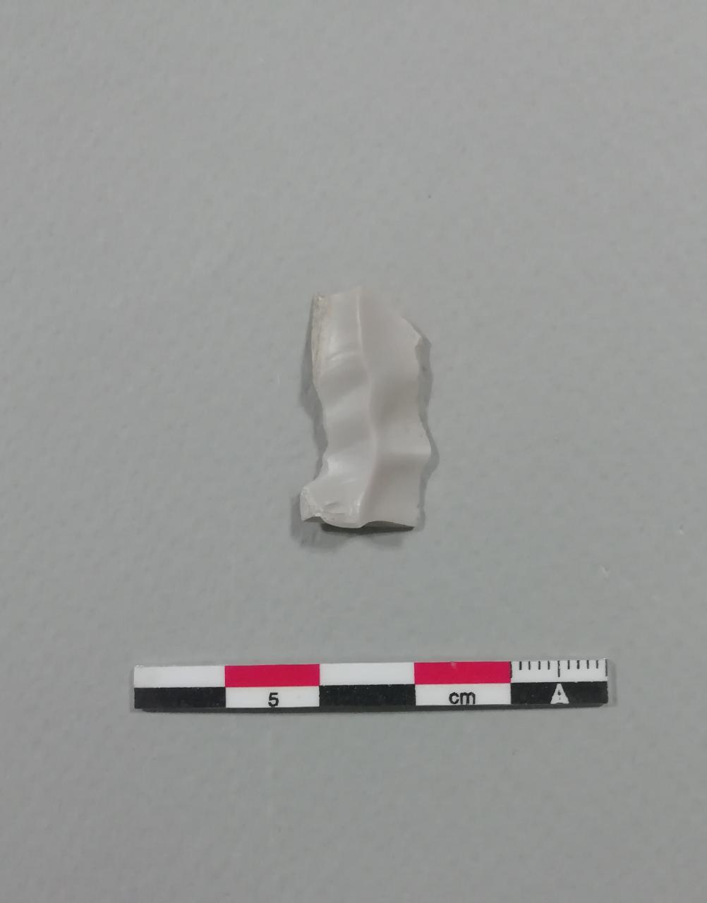 Raschiatoio denticolato su lama (D2) a sezione triangolare in selce bianca con cortice, frammentata alle due estremità. Ritocco semplice marginale diretto parziale sul lato sinistro e inverso totale sul lato destro.