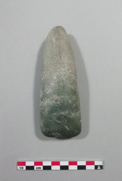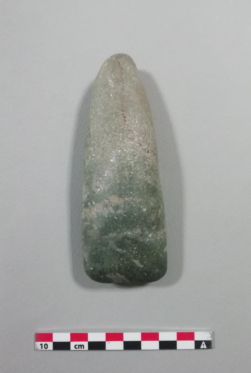 Ascia in serpentino. Tagliente rettilineo, lisciato e con probabili tracce di utilizzo. Bordi leggermente convessi, tallone arrotondato. Sezione convessa. Riconducibile probabilmente a asce di tipo Chelles.