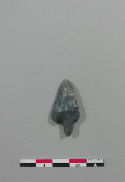 Punta di freccia foliata con peduncolo e spalle (F1B) in selce grigia, fratturata sul lato destro durante l'utilizzo e rimessa in forma, fratturata anche sulla spalla sinistra. Ritocco piatto coprente bifacciale. Bordi rettilinei, punta a bordi convessi, spalle orizzontali, peduncolo a lati paralleli, base del peduncolo rettilinea, sezione convessa.