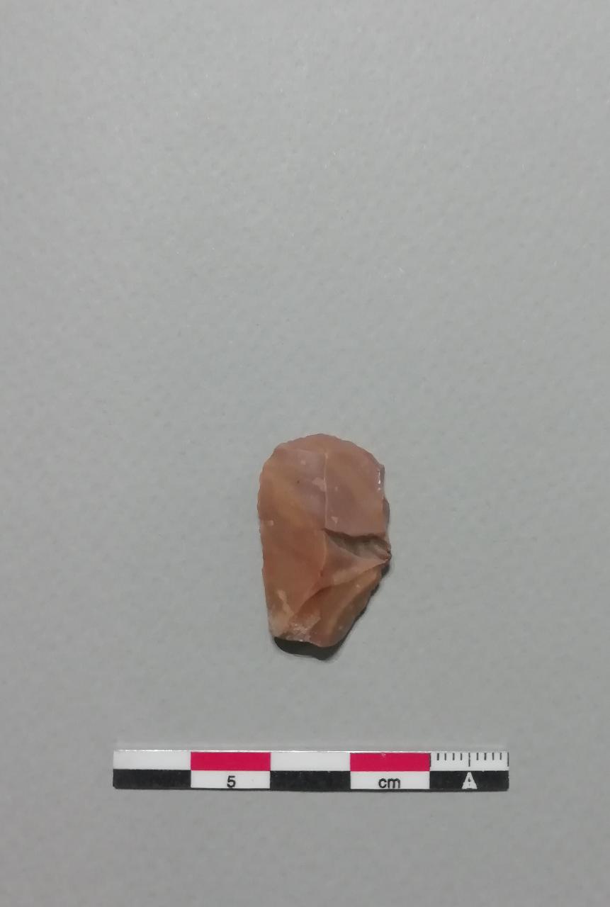 Grattatoio frontale lungo (G1) su lama a sezione trapezoidale in selce marrone. Ritocco semierto diretto nella parte distale.