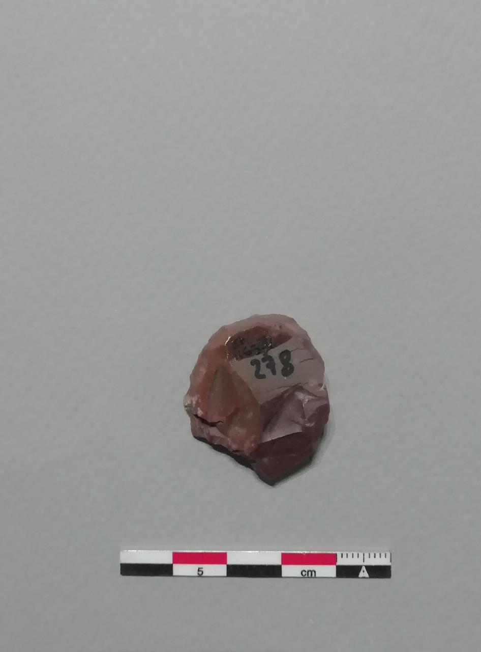 Grattatoio frontale corto (G3) in selce rossa, con tracce di esposizione al calore. Ritocco semierto nella parte distale.
