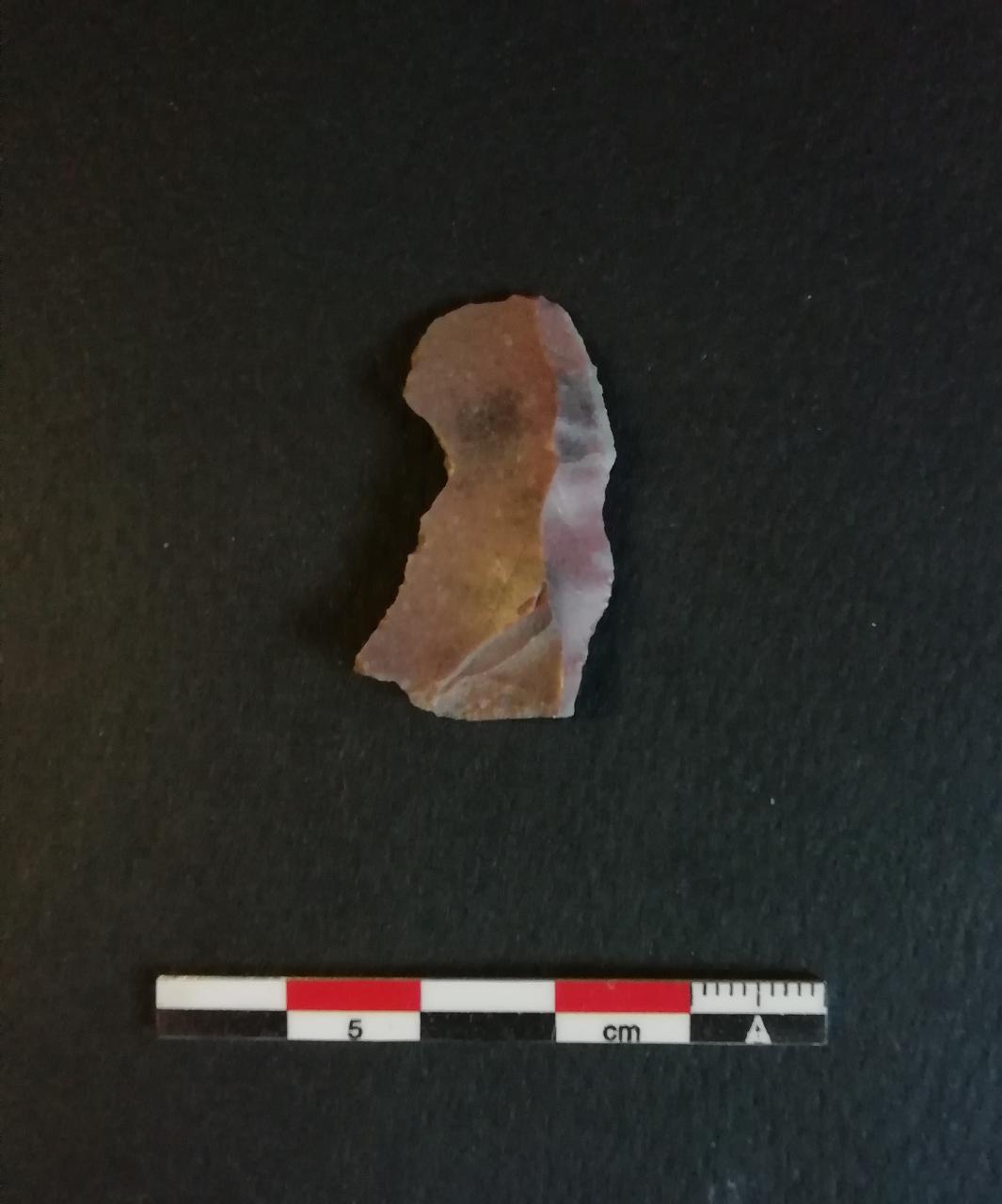 Denticolato (D1) su lama a sezione trapezoidale in selce bordeaux. Ritocco erto inverso nella parte distale e sul lato sinistro a formare una tacca.