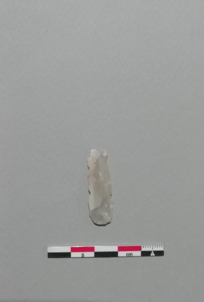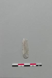 Troncatura normale (T2) su lama a sezione triangolare in selce grigia. Ritocco erto nella parte distale e ritocchi semplici marginali lungo entrambi i lati.