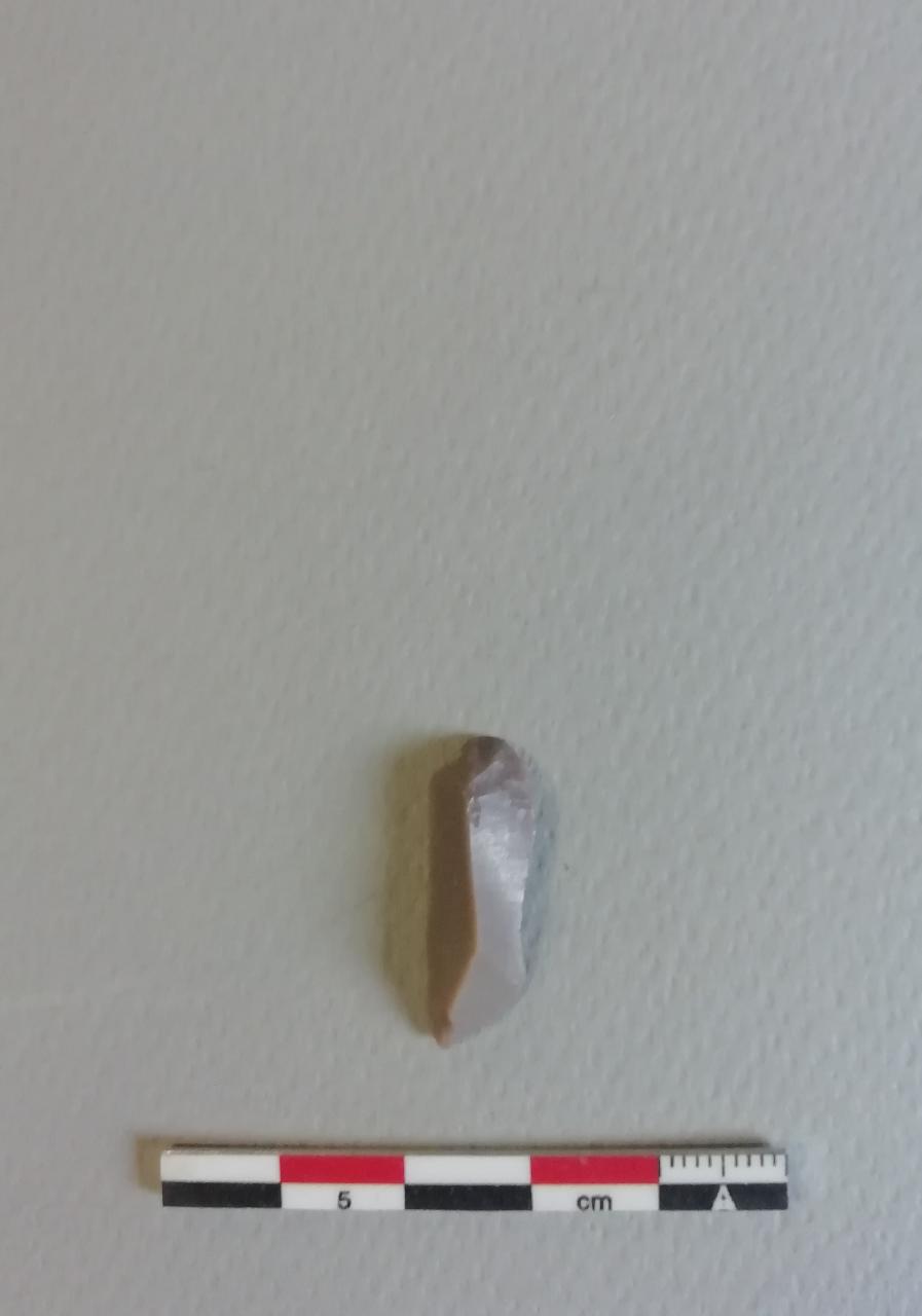 Grattatoio frontale corto (G1) su lama in selce marrone. Ritocco semierto invadente diretto totale nella parte distale.