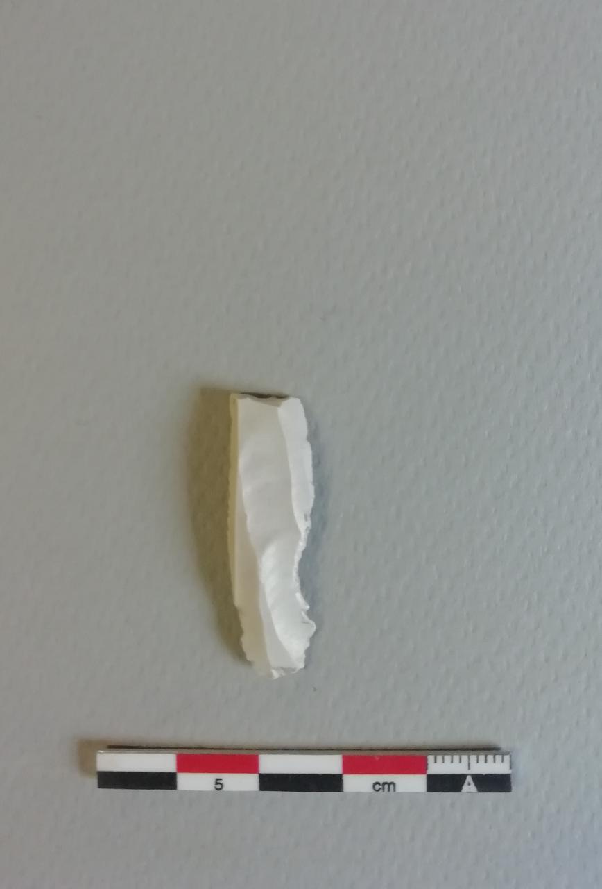 Lama a dorso e troncatura normale (DT1) in selce bianca. Ritocco erto sulla troncatura distale rettilinea e semierto diretto a formare un incavo nella parte inferiore del lato destro.