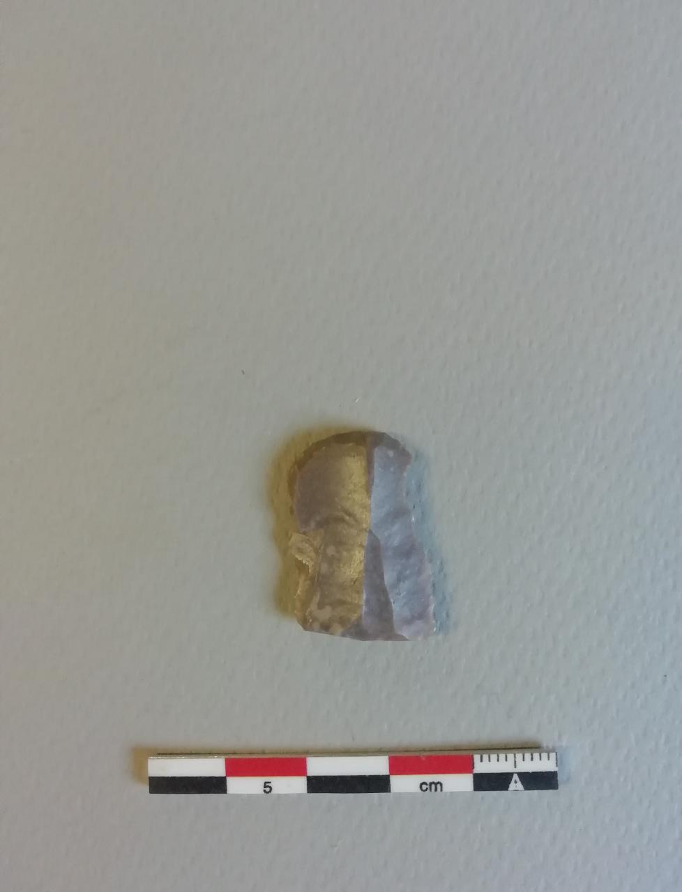 Grattatoio frontale corto (G3) opposto a troncatura normale (T2) e bulino semplice a un piano (B1) su lama in selce marrone, frammentario lungo il lato destro. Ritocco semierto diretto nella parte distale; ritocco erto nella parte prossimale dritta; stacco di bulino inverso destro. Pseudo-ritocchi nella parte prossimale fratturata dovuta probabilmente all'immanicatura.