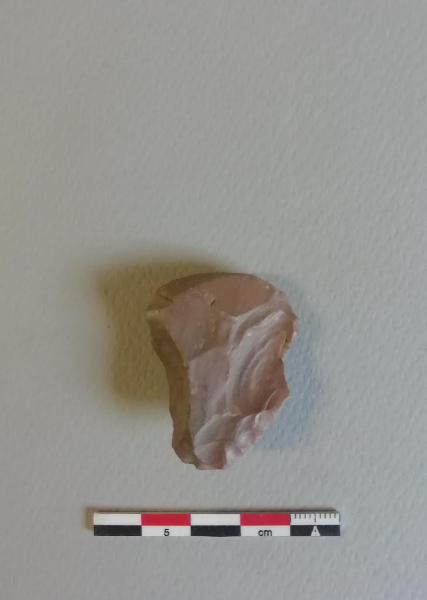 Denticolato (D1) su scheggia in selce marrone. Ritocco erto lungo il lato destro a formare un incavo. Nella parte distale un ravvivamento di nucleo.
