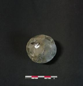 Nucleo per schegge su ciottolo in selce grigia con cortice, riutilizzato come percussore.