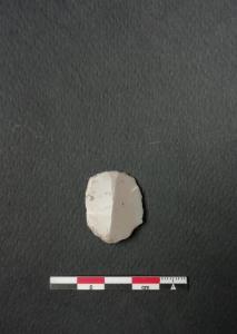 Grattatoio frontale corto (G3) su scheggia in selce bianca. Ritocco erto sia sulla parte distale che prossimale a formare un doppio grattatoio.