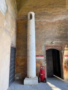 Il fusto di colonna proviene dall'antica cattedrale di Pavia. Il calcare veronese era molto apprezzato in età romana per i colori caldi e i disegni sulla superfice. Il foro sulla sommità fu realizzato in fase di reimpiego.
