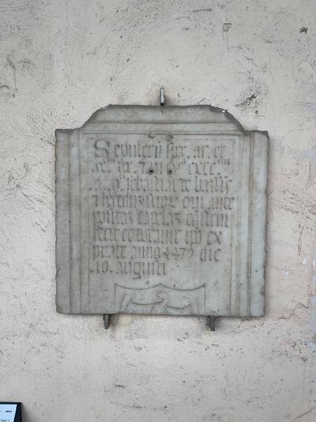 Proveniente dalla chiesa di S.Invenzio, la lastra è dedicata a Sebastiano Bassini, lettore di chirurgia con 38 anni di carriera.