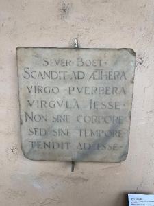 L'iscrizione proviene dalla chiesa di S.Invenzio, l'esaltazione di Maria come "Virgo Puerpera", e di Gesù come "Virguita Jesse" evidenziano come nell'autore il carattere di un ecclesiastico sostenitore del culto dell'Immacolata. Il quale fa riferimento al libro dell' Emmanuele di Isaia e cerca sostegno nell'autorità di Boezio.