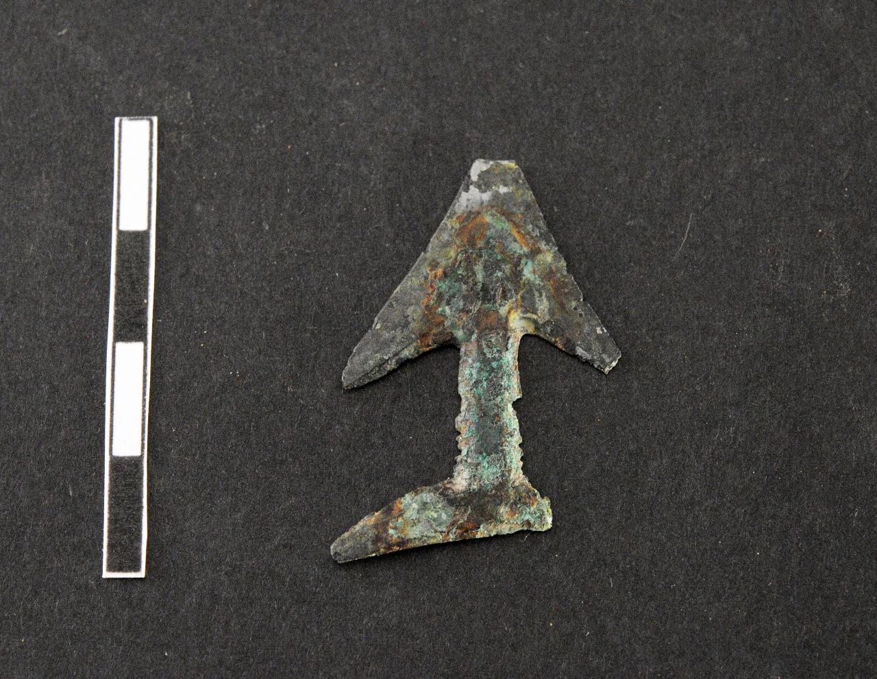 Punta di freccia ad alette con codolo e apicagnolo laterale in lamina di bronzo
