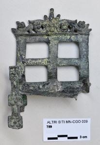 Trono in bronzo per statuetta di divinità con coronamento di ispirazione vegetale, spalliera con suddivisione a croce, supporti anteriori decorati da fiori a quattro petali e sui lati panno terminante con frange.