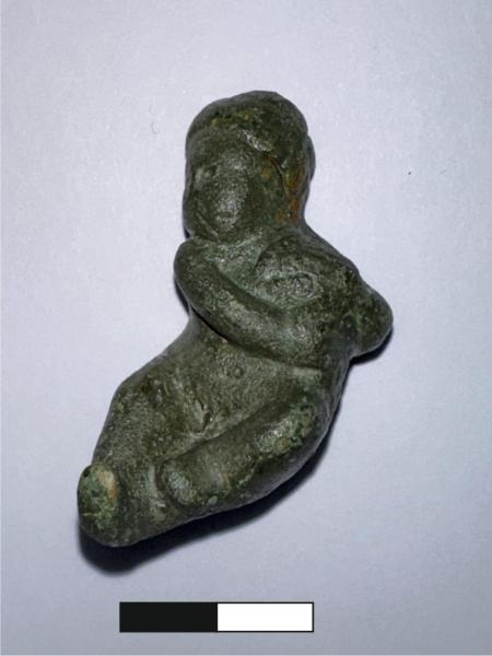 Amorino ornamentale in bronzo. L'infante è in torsione, volge la testa a destra e racchiude fra le braccia presso il fianco sinistro un grappolo d'uva. Venne riutilizzato come aequipondium mediante la realizzazione di due fori nella testa per l'inserimento di un gancio di sospensione e di un foro sul fondo attraverso il quale venne colato piombo nel corpo