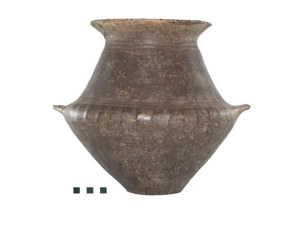 Urna biconica con spalla distinta, sviluppata ed espansa, decorata a costolature; orlo estroflesso decorato a tacche oblique. Decorazione a solcature orizzontali parallele sulla gola (3) e sopra la spalla (3), da cui si dipartono due prese trapezoidali a linguetta. Decorazione a coppelle appena sopra le prese. Il ventre ha un profilo lievemente convesso, terminante in un fondo stretto e concavo. Impasto medio grigio, superficie lisciata semilucida grigio scuro.