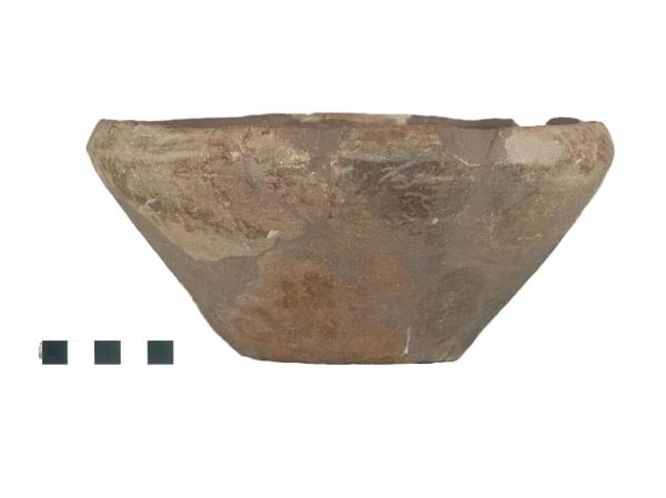 Scodella con orlo appiattito obliquo, alta carena e breve parete superiore rettilinea rientrante, vasca troncoconica, fondo piatto. Impasto raffinato camoscio, superficie lisciata lucida beige.
