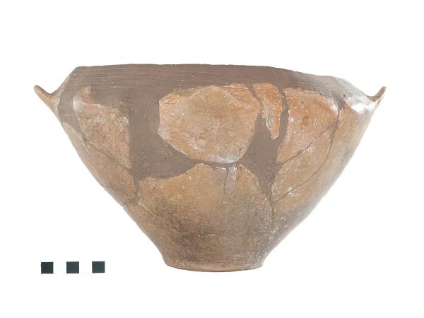 Vaso biconico con carena arrotondata decorata a piccole bugne, con quattro prese a linguetta triangolare, oblique verso l'alto, decorato con un fascio di strette solcature sopra alla carena. Fondo concavo. Impasto medio grigio, superficie lisciata semilucida grigio chiara.