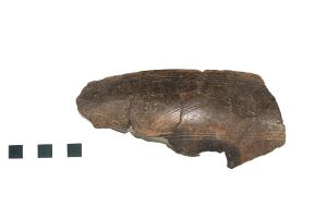 Ciotola a corpo globulare con orlo ingrossato e obliquo verso l'interno, decorazione a fasci di sottili solcature orizzontali e obliqui e grandi motivi circolari con punto interno. Impasto raffinato grigio, superficie lisciata semilucida bruna.