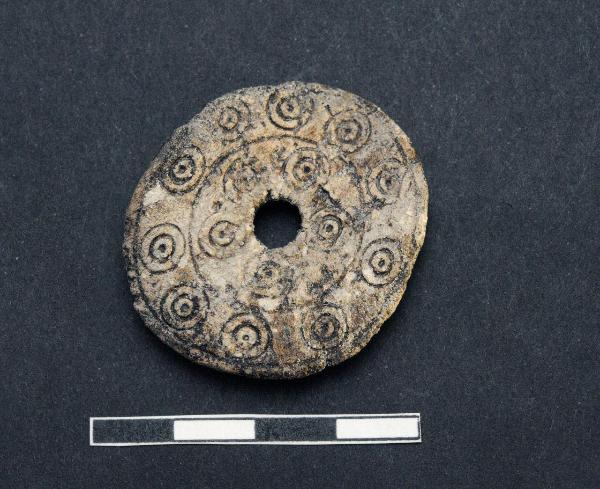 Rotella con foro passante centrale e decorazione a fasce concentriche delimitate da incisioni e campite di occhi di dado.