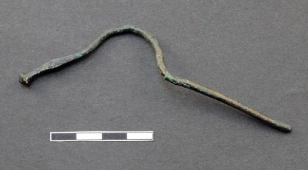 Spillone tipo Verrucchio con capocchia biconica, collo ingrossato a sezione quadrata, gambo lungo a sezione circolare, decorato a motivi a spina di pesce.