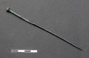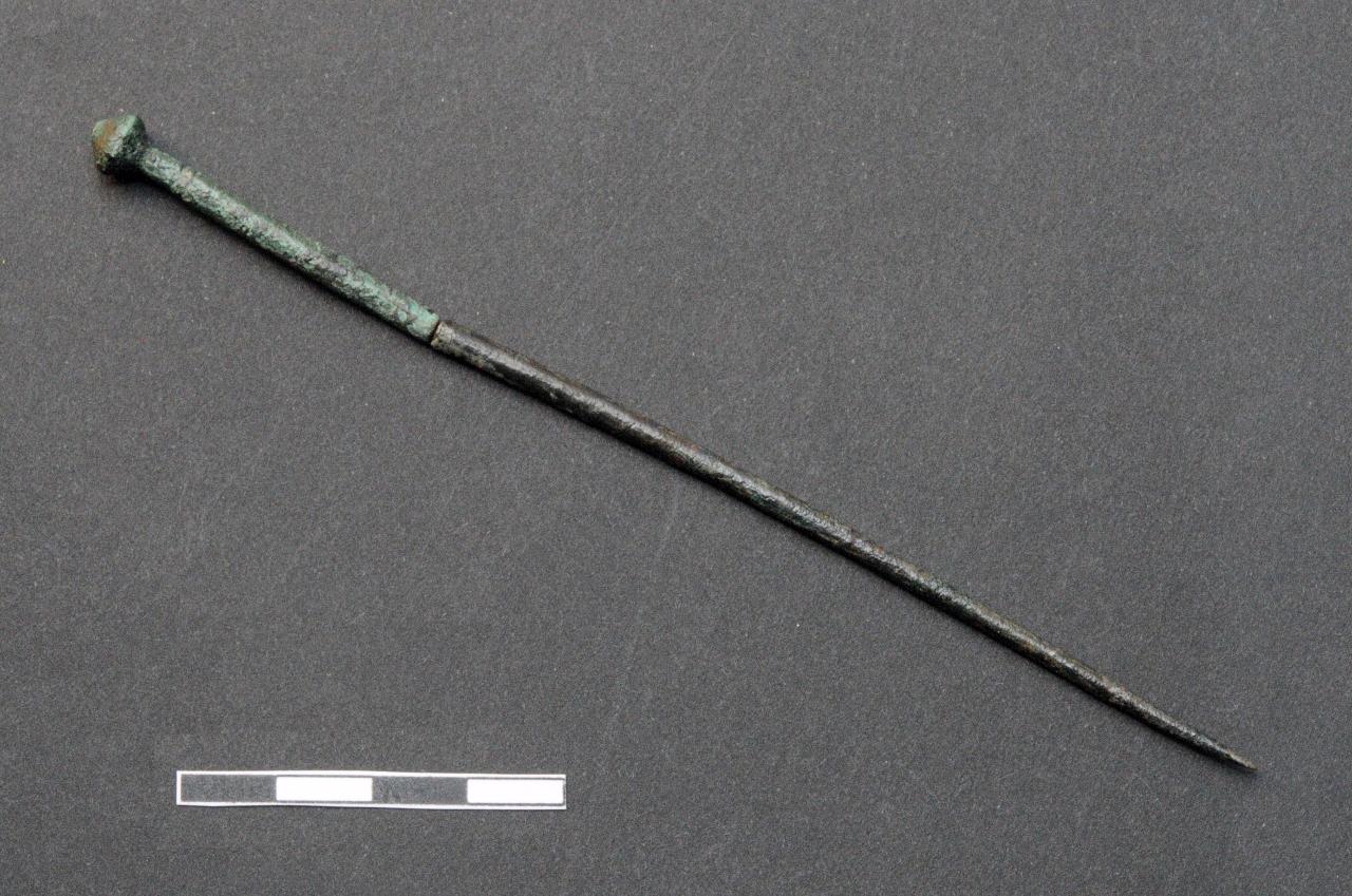 Spillone con capocchia biconica e collo dritto decorato da due linee incise orizzontali, a sezione circolare.