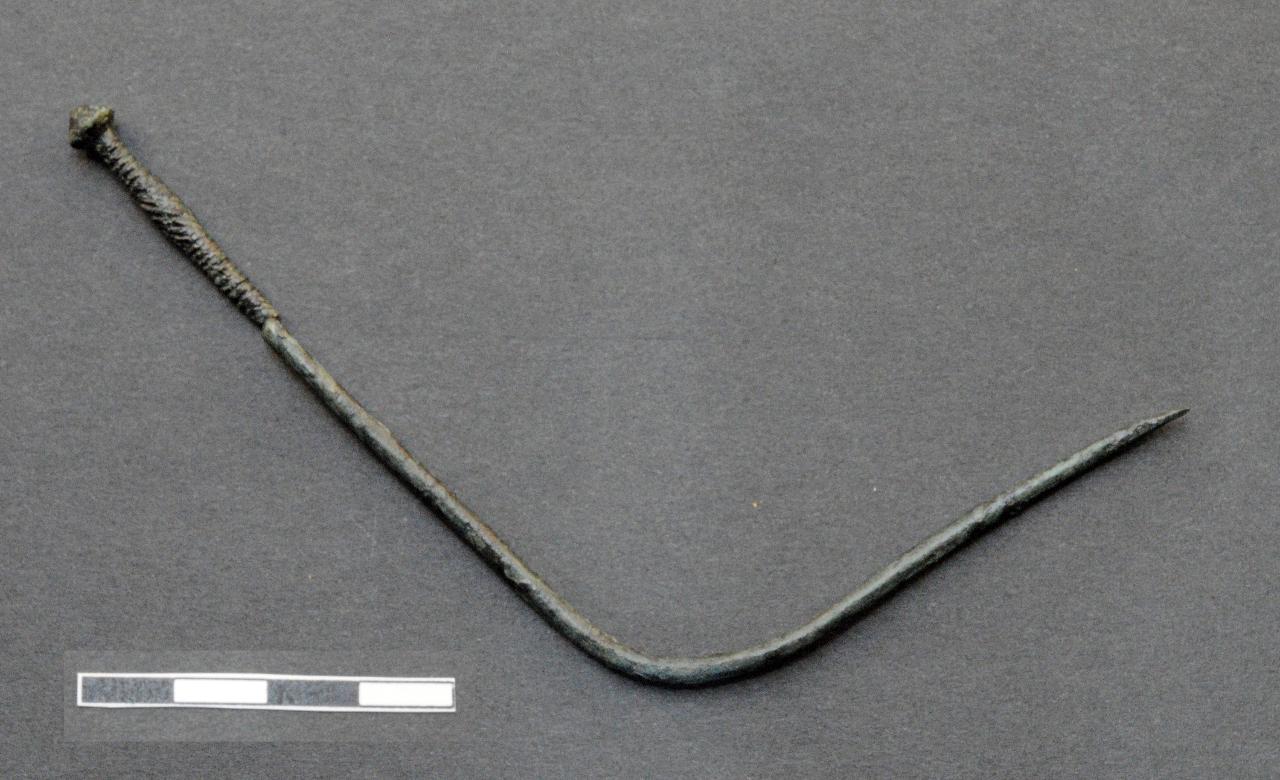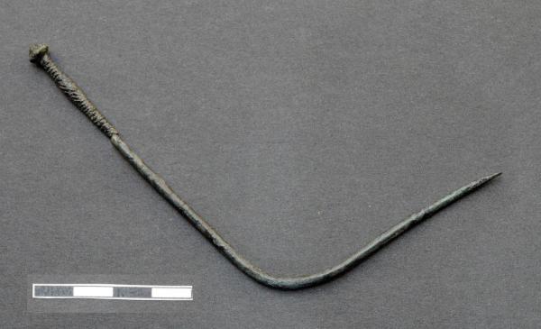 Spillone con capocchia biconica e collo debolmente ingrossato, decorato da due fasci di costolature orizzontali che delimitano una fascia decorata a motivo a tortiglione. Sotto la fascia inferiore di costolature è presente una decorazione a linee oblique. Gambo di incerta pertinenza è a sezione circolare e munito di punta.