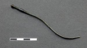 Spillone con capocchia biconica e collo debomente ingrossato, decorato da fasci distanziati di piccole costolature orizzontali, che delimitano una fascia, corrispondente con il punto di massimo rigonfiamento del collo, decorata con un motivo a soina di pesce ormai poco visibile. Gambo di incerta pertinenza.