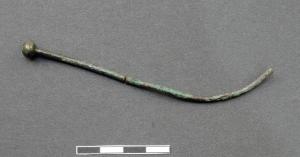 Spillone con capocchia globulare schiacciata, collo non distinto decorato con due larghe fasce di linee orizzontali, separate da uno spazio decorato a motivi a spina di pesce, che sono ripresi sotto la seconda fascia. La lettura della decorazione è difficile. Di incerta pertinenza è il gambo di spillone a sezione circolare, siglato pc90/c. Unito al pezzo non corrisponde al disegno di uno spillone completo fatto da L. Salzani che forse ha unito PC90c con PC99A che però ha poi ridisegnato. Nella scheda cartacea PC90c è disegnato senza gambo. Carancini lo disegna completo!