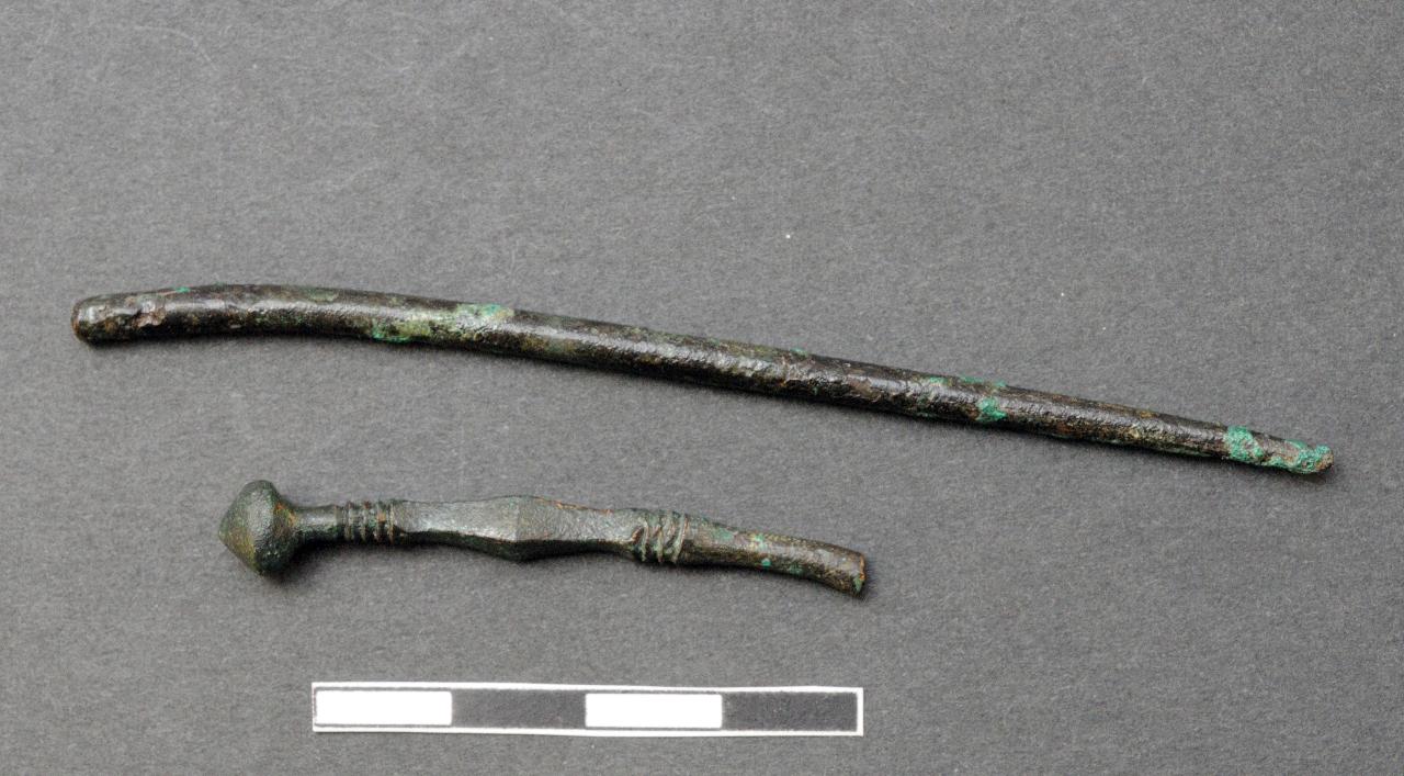 Spillone con testa biconica e collo debolmente ingrossato, decorato da due fasci distanziati di costolature, separate da un rigonfiamento centrale sfaccettato tra due strozzature a sezione quadrangolare. Gambo di incerta pertinenza, a sezione circolare, che secondo scheda cartacea era pertinente a PC091, ma successivamente gli è stato attribuito il n. 1002.