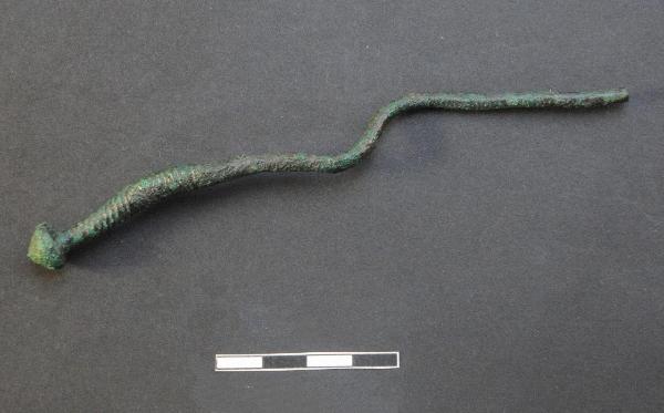 Spillone con capocchia biconica, collo leggermente ingrossato e decorato con due tratti contigui a torsione contrapposta. Gambo a sezione circolare.