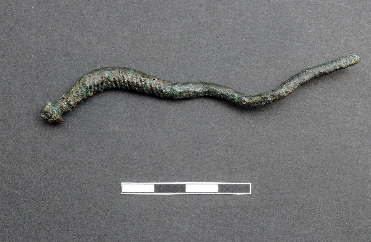 Spillone con capocchia conica, collo leggermente ingrossato e decorato con due tratti a torsione contrapposta, contigui. Gambo a sezione circolare.